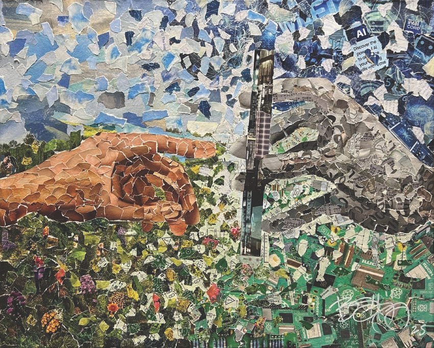 Unnatural Evolution (2025) by Bryan S. Higgins. Canvas substrate—gardening and nature-related magazines/computer science and technology magazines/Elmer’s Glue Stick. All pieces torn and applied individually, 16” x 20”.