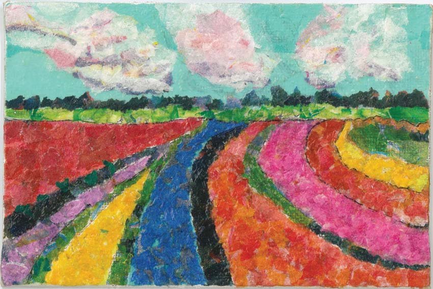 Artist statement: Growing Curves explores the idea that learning is rarely linear. The curved rows of flowers bend, widen, and shift direction, echoing the nonlinear paths we take as we grow. Some rows stretch all the way toward the horizon, while others—like the purple one—end earlier, reflecting interests or lessons that we naturally stop pursuing. Each curve represents a different form of progress, even when that progress moves sideways instead of straight ahead. Together, the rows create a landscape of growth that is winding, uneven, complex, and as beautiful as the paths of discovery and learning themselves.