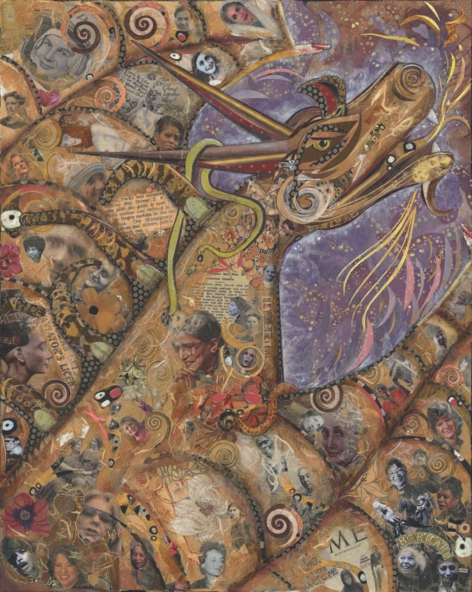 Women on Fire (2024) by Mitzi Bernard. Canvas covered entirely with tiny pieces of paper found from magazines, books, and scrap discarded paper, 24” x 30”.