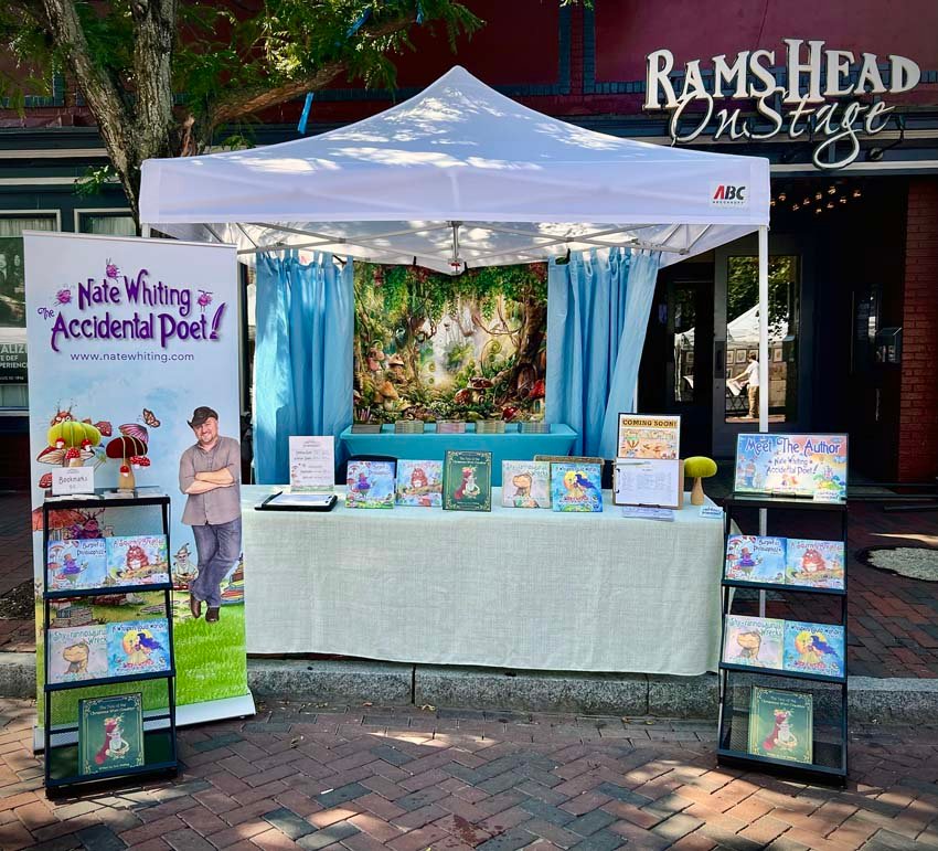 Whiting promotes his books at various events, including the First Sunday Arts Festival, the Annapolis Holiday Market, and Christmas in July at the Howard County Fair, where he served as an event entertainer, reading to children hourly. He also does book signings, such as at Wyrd Bookstore in Edgewater. In 2025, Whiting was selected (out of hundreds of author submissions received) to be one of two featured authors at the Maryland Renaissance Festival’s Children’s Weekend.