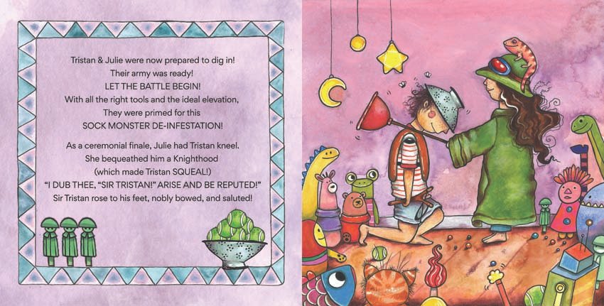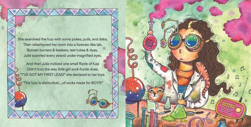 The forthcoming A Sock Monster Army is the first book of a new series, The Adventures of Julie & Tristan, and has a local connection. Julie Cymek of the band Sweet Leda couldn’t find a pair of her favorite socks before a gig and posted about it on social media. “I responded with stanzas. I write poems to get my point across,” says Whiting. That response seeded the idea for the new series. Whiting, who is also a musician (singing in Nate and Jim Acoustic Duo and in Left of the Dial), is friends with Cymek. He has joined Sweet Leda onstage for a song or two, and they often run into each other when playing at venues. Cymek inspired the heroine of the series, and Tristan is inspired by Sweet Leda’s current drummer, Tristan Gilbert.